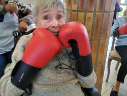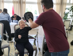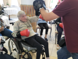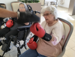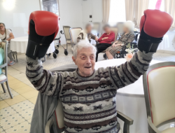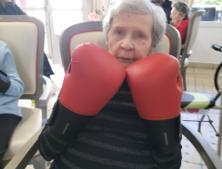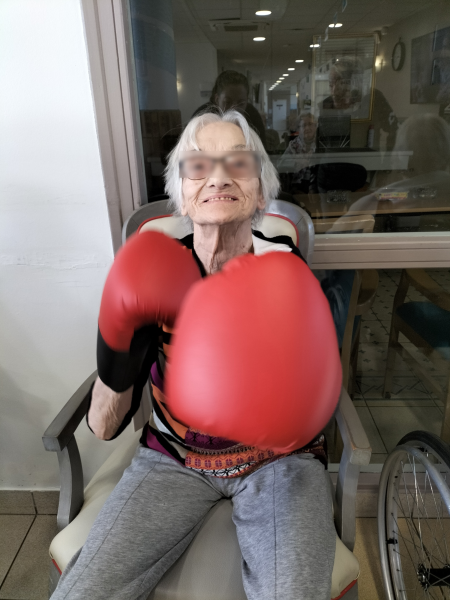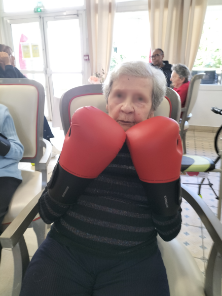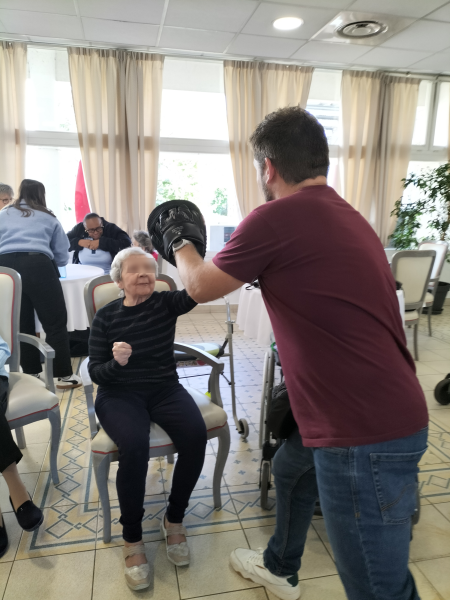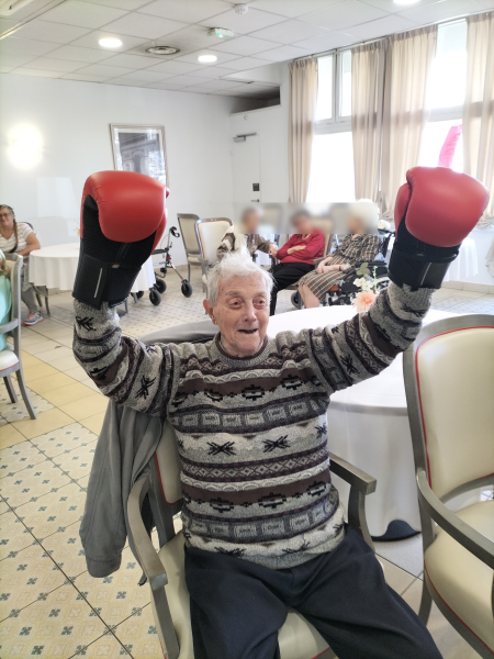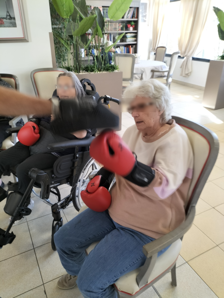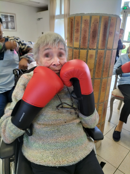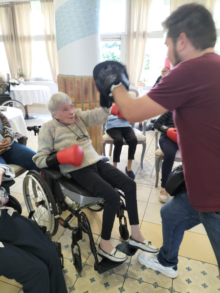 Les résidents se sont amusés à apprendre quelques gestes simples de boxe : direct, crochets, uppercuts, toujours dans la bonne humeur et en douceur. Mais ce qui a vraiment marqué la séance, se sont les rires de tous les résidents qui ont envahi la salle !