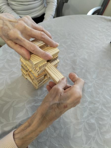 Il s'agit de construire une tour en empilant des morceaux de bois sans les faire tomber. L'exercice stimule à la fois l'observation, l'analyse, l'agilité, la concertation, tout en renforçant le lien social entre les participants. Les éclats de rire et les échanges ont rendu l’atelier encore plus agréable et motivant pour tous.