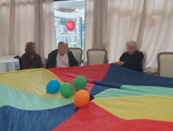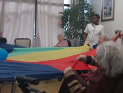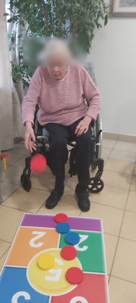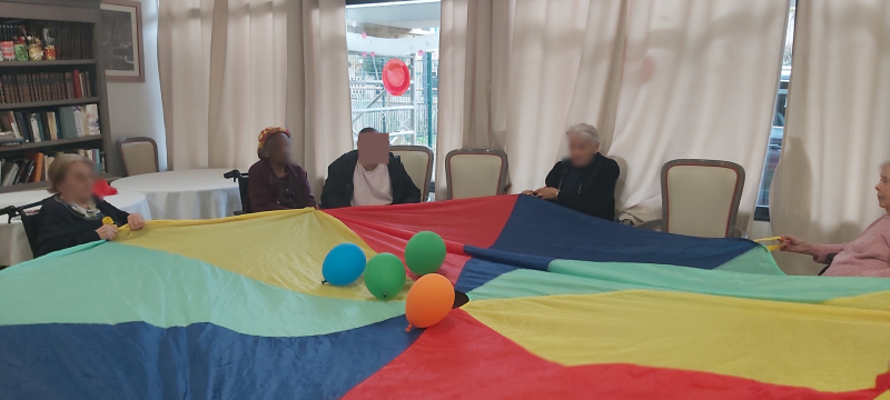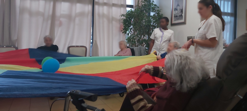 Trois jeux d'adresse sont proposés aux résidents.Jeu du lancer de palet, puis un peu plus difficile celui du lancer d'anneaux, et enfin le jeu du parachute avec deux équipes qui se sont affrontées .