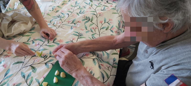 Petit jeu en début de séance dont l'objectif de l'exercice était de se remémorer les expressions qui comprennent des animaux type: il fait un temps de chien, ou bien poser un lapin à quelqu'un. Quasiment toutes les personnes ont participé.Suivi d'un temps de découpage de légumes pour les cochons d'inde. Chaque résident a pu choisir quel aliment il voulait découper, avec ou sans aide. Tous ont joué le jeu et se sont appliqués. Le groupe a ainsi créé deux belles brochettes avec du concombre, des poivrons, un peu de pomme et des feuilles de radis. Les cochons d'Inde : Orel et Goupi ont été très participatifs, pendant que Geicko restait un peu dans son coin ce qui a permis à tous les résidents d'avoir un rongeur devant lui et de l'observer manger. Une belle séance !