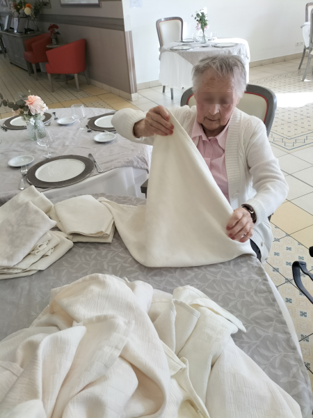 Mme C., prête et disponible tôt le matin, nous a sollicités pour trouver une occupation utile les débuts de matinées. Nous lui avons proposé de participer à certaines tâches de la vie quotidienne de la Résidence et de prêter main forte aux agents hôteliers en pliant les serviettes de table et en les distribuant sur les tables du restaurant.