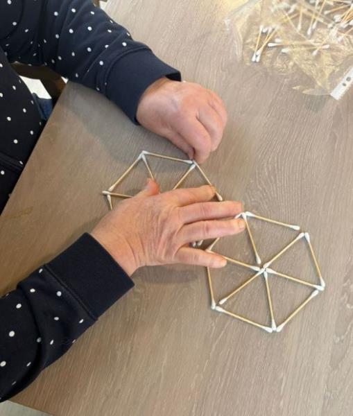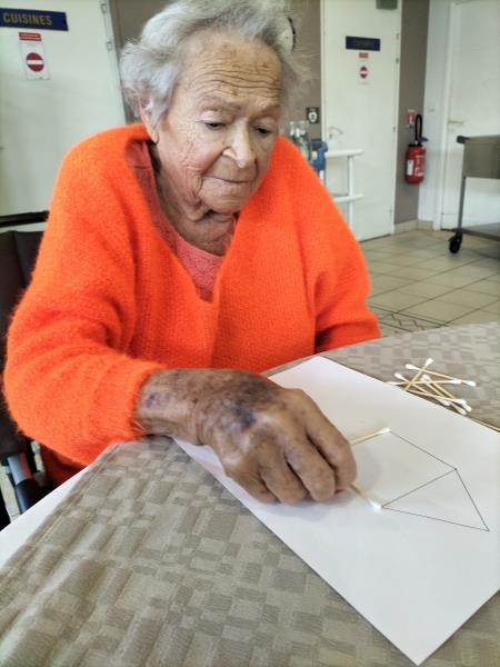 Les résidents ont apprécié cette activité qui consistait à reproduire des symboles avec des cotons tige. Cela leur a permis de travailler la motricité fine, la motricité œil main, créativité et imagination, dans une ambiance intergénérationnelle chaleureuse.
